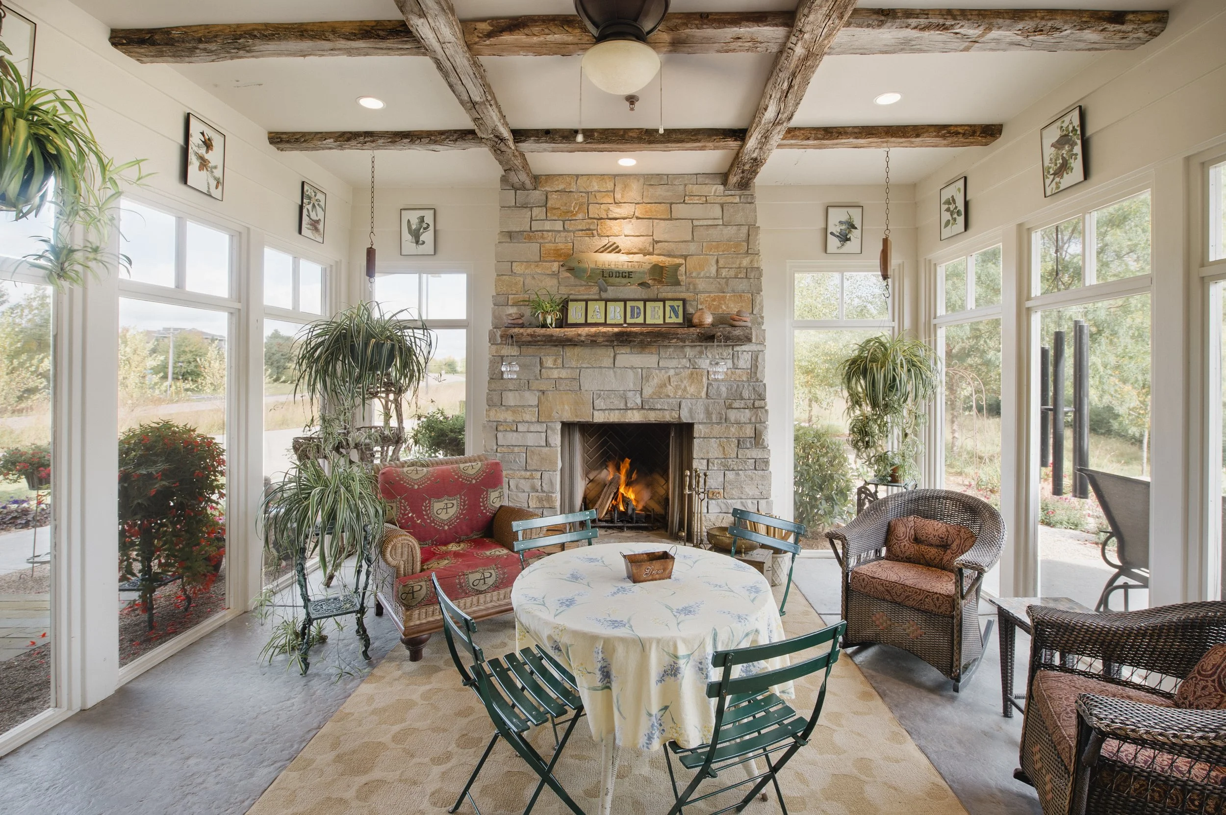 Our charming screened garden porch is a beautiful place to sit and enjoy warm breezes and views of the lake and grounds. Come out for a lunch break or meeting or just sit by the wood burning fireplace...you'll come away refreshed.